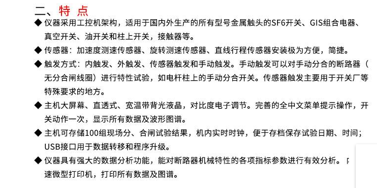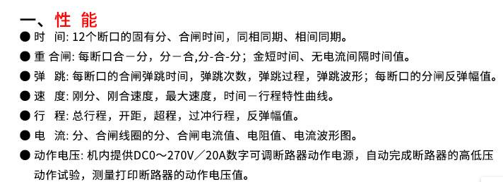 | l HTGKC-12F高壓開關(guān)測(cè)試儀適用于國內(nèi)外生產(chǎn)的所有型號(hào)的SF6開關(guān)、GIS組合電器、真空開關(guān)、油開關(guān)的機(jī)械特性試驗(yàn)。 l 超強(qiáng)的抗干擾能力,在500KV變電站旁路母線帶電的情況下,也能輕松試驗(yàn),精確測(cè)量。 l 通用式測(cè)速傳感器,直線傳感器,旋轉(zhuǎn)傳感器,安裝極為方便、簡(jiǎn)捷。 l 開關(guān)動(dòng)作一次,得到開關(guān)機(jī)械特性試驗(yàn)所有數(shù)據(jù)及相應(yīng)的波形圖譜。 l 主機(jī)可存儲(chǔ)現(xiàn)場(chǎng)試驗(yàn)數(shù)據(jù),機(jī)內(nèi)實(shí)時(shí)時(shí)鐘,便于存檔保存試驗(yàn)日期、時(shí)間。 l 主機(jī)大屏幕、寬溫度、直透視、背景光液晶、全中文顯示所有數(shù)據(jù)及圖譜,液晶對(duì)比度電子調(diào)節(jié)、斷電記憶。 l 中文菜單操作,使用方便。儀器內(nèi)置打印機(jī),隨時(shí)快速打印所有數(shù)據(jù)及圖譜。 開關(guān)測(cè)試儀技術(shù)參數(shù) 1、使用環(huán)境 溫 度: -10~40℃ 濕 度: ≦80%RH 2、安全性能 絕緣電阻: >2MΩ 介電強(qiáng)度: 電源對(duì)機(jī)殼工頻1.5KV耐壓1分鐘,無閃絡(luò)與飛弧。 3、基本參數(shù) (1)時(shí) 間:量程 4000.0ms 分辯率0.1ms